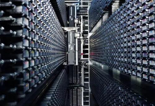 CERN計(jì)算機(jī)中心的自動(dòng)磁帶存儲(chǔ)庫(kù)(2008年),磁帶用來(lái)存儲(chǔ)LHC的實(shí)驗(yàn)數(shù)據(jù),機(jī)械臂用于在存儲(chǔ)架和驅(qū)動(dòng)器間運(yùn)送磁帶,磁帶的調(diào)用完全自動(dòng)化(圖片來(lái)自網(wǎng)絡(luò))